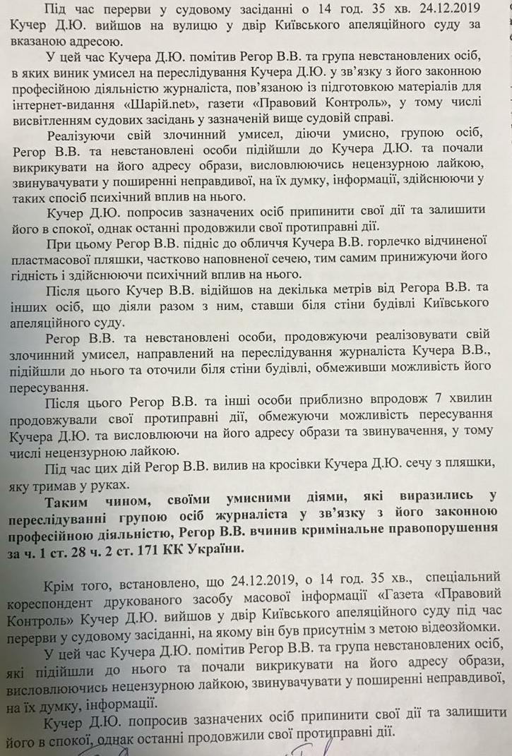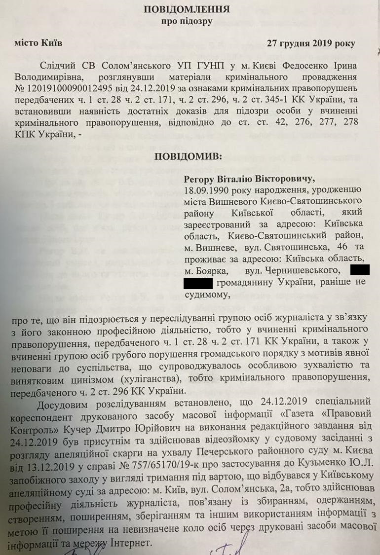 Одному из фигурантов нападения на журналистов под зданием Киевского апелляционного суда во время рассмотрения меры пресечения подозреваемым в убийстве Павла Шеремета, вручили подозрение. Об этом сообщил юрист Андрей Портнов в Телеграме.