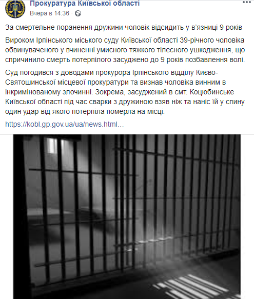 Уточняется, что подсудимый причинил женщине умышленное тяжкое телесное повреждение, повлекшее смерть потерпевшей. Убийство произошло в пгт Коцюбинское. Во время ссоры с женой мужчина схватил нож и ударил им женщину в спину. От полученного ранения потерпевшая скончалась на месте.