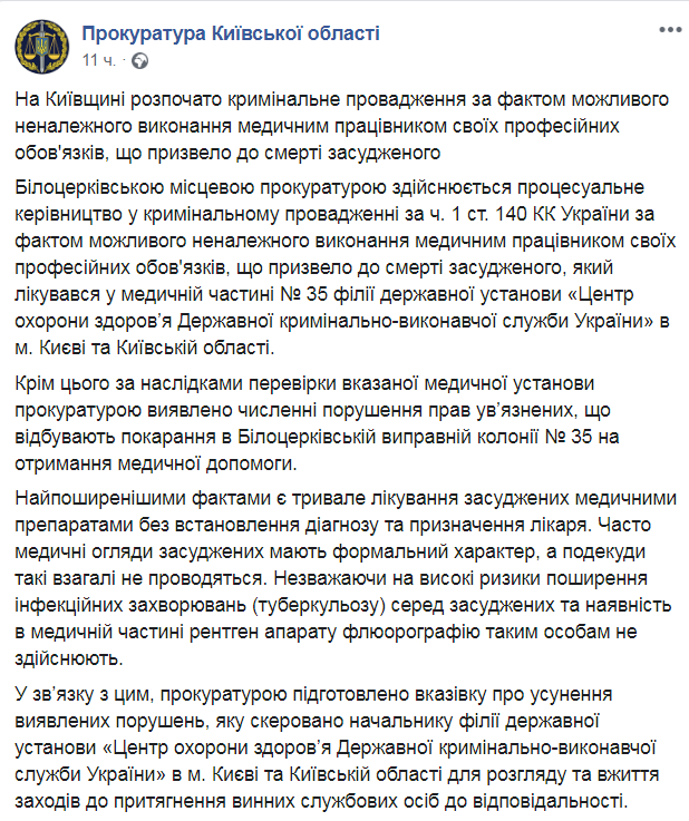 В Киевской области начато уголовное производство в связи с возможным ненадлежащим исполнением медицинским работником своих профессиональных обязанностей, что повлекло смерть осужденного из Белоцерковской колонии. Об этом сообщает в Facebook пресс-служба прокуратуры области.
