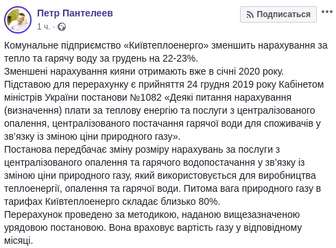 Основанием для перерасчета является принятие 24 декабря 2019 Кабинетом министров Украины постановления по поводу коммунальных платежей. Постановление предусматривает перерасчет цены на отопление и горячую воду в случае, если упадет цена газа. Об этом сказал на свой странице в Facebook заместитель мэра Киева Перт Пантелеев. Также чиновник объяснил, что стоимость газа в платежках - это большая часть цены.