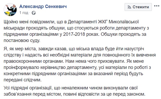 В департаменте ЖКХ Николаевского горсовета проходит обыск. Об этом мэр Николаева Александр Сенкевич написал в своем Facebook.