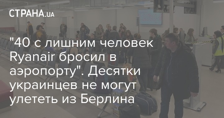 Украинские туристы, которые должны были лететь в Киев рейсом лоукост-авиакомпании Ryanair (FR 3198) Берлин — Борисполь, застряли в аэропорту Берлина Шенефельд. Как сообщил блогер Денис Гороховский, который является другом нескольких пострадавших, всего брошенными оказались около 40 человек.
