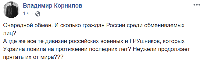 13:32  "Очередной обмен. И сколько граждан России среди обмениваемых лиц? А где же все те дивизии российских военных и ГРУшников, которых Украина ловила на протяжении последних лет? Неужели продолжает прятать их от мира?", - задает вопрос политолог Владимир Корнилов.