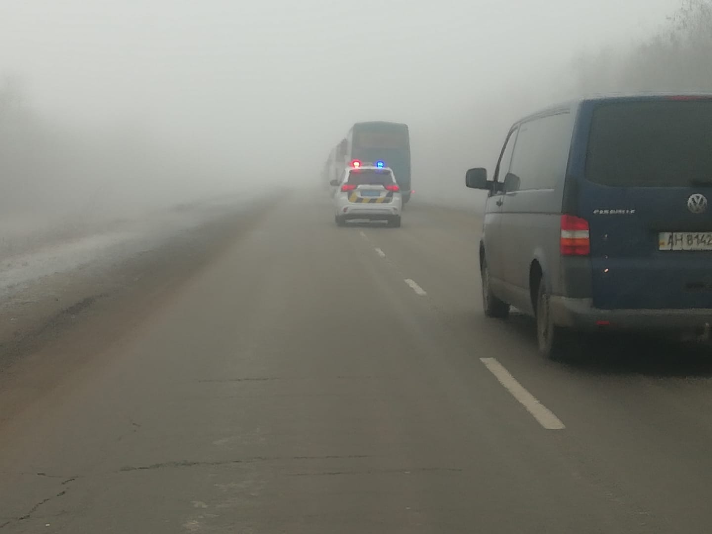 Параллельно с территории, подконтрольной Украине, выехали автомобили. Им пришлось передвигаться в густом тумане, который опустился на Донецкую область.