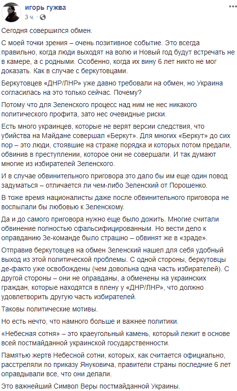 Отправив беркутовцев на обмен Зеленский нашел для себя удобный выход из этой политической проблемы. С одной стороны, беркутовцы де-факто уже освобождены (чем довольна одна часть избирателей). С другой стороны – они не оправданы, а обменены на украинских граждан, которые находятся в плену у "ДНР/ЛНР", что должно удовлетворить другую часть избирателей.