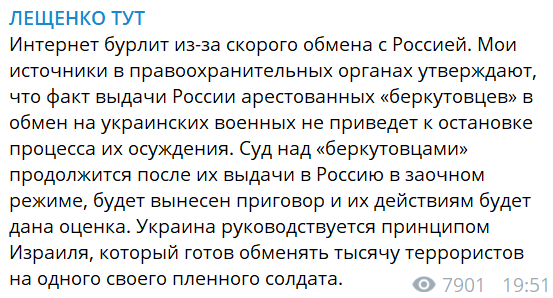 "Мои источники в правоохранительных органах утверждают, что факт выдачи России арестованных "беркутовцев" в обмен на украинских военных не приведет к остановке процесса их осуждения. Суд над "беркутовцами" продолжится после их выдачи в Россию в заочном режиме, будет вынесен приговор и их действиям будет дана оценка. Украина руководствуется принципом Израиля, который готов обменять тысячу террористов на одного своего пленного солдата".