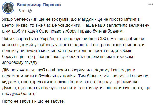 Один из майдановцев и бывший нардеп Владимир Парасюк, которого вместе с отцом обвиняют в стрельбе на Майдане, заявил, что обмен беркутовцев противоречит национальным интересам и это план Путина.