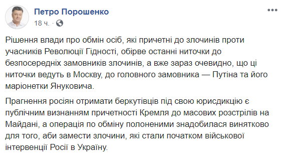 "Главный государственный преступник (Порошенко - Ред.) заявил сегодня, что решение об обмене сотрудников Беркута оборвёт последние нити непосредственных заказчиков преступлений на Майдане.