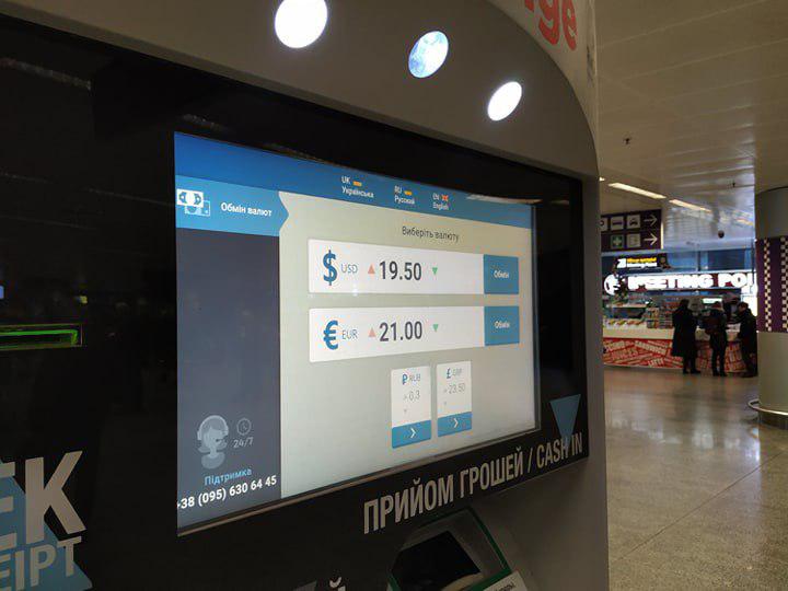 Так, за один доллар в обменнике предлагают 19,50 гривен. Как видно на фото, сделанном в аэропорту, за один евро предлагается 21 гривна.