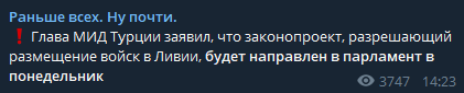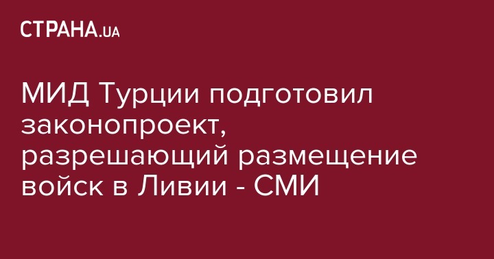 Глава Министерства иностранных дел Турции Мевлют Чавушоглу заявил, что законопроект, который разрешает размещение войск в Ливии, будет направлен в парламент в понедельник, 30 декабря.
