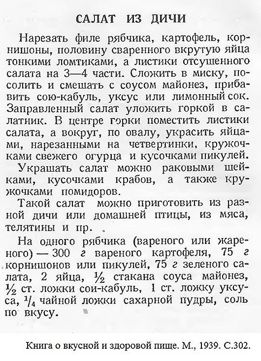 В советской "Книге о вкусной и здоровой пище" 1948 года рецепт выглядит так: мясо рябчика (отварное или жареное), картофель, свежие или соленые огурцы, яйца, зеленый салат, майонез, соя-кабуль, уксус или лимонный сок, сахарная пудра.