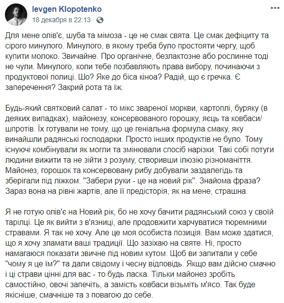 "Для меня оливье, шуба и мимоза - это не вкус праздника. Это вкус дефицита и серого прошлого. Прошлого, в котором надо было простоять очередь, чтобы купить молоко. Обычное. Об органическом, безлактозном или растительном тогда не слышали. В прошлом, когда тебя лишают права выбора, начиная с продуктовой полки. Что? Какое к черту киноа? Радуйся, что есть гречка.