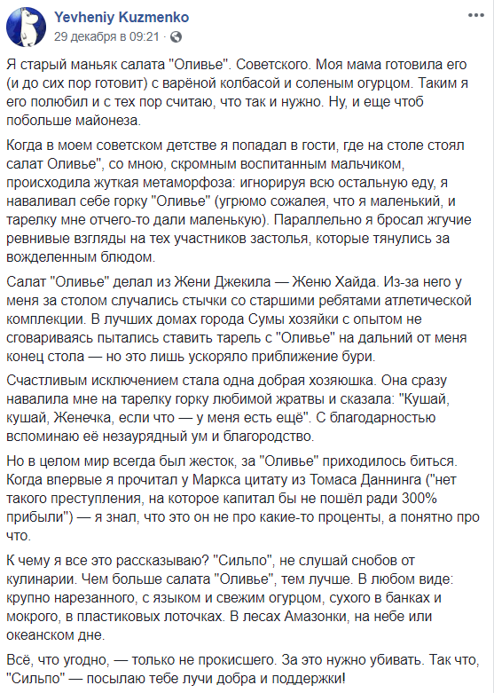 Журналист Евгений Кузьменко написал целую сагу об "Оливье":