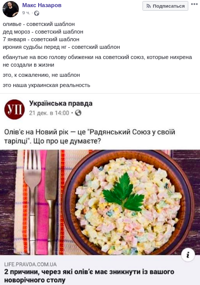 "Оливье - советский шаблон, дед мороз - советский шаблон, 7 января - советский шаблон, Ирония Судьбы перед НГ - советский шаблон. Е@нутые на всю голову обиженки на советский союз, которые нихрена не создали в жизни - это, к сожалению, не шаблон, это наша украинская реальность" - считает телеведущий Макс Назаров.
