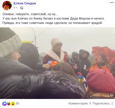 "Оливье, говорите, советский, ну-ну... У вас вон Кличко по Киеву бегает в костюме Деда Мороза и ничего. Правда, его тоже советские люди сделали, но попахивает зрадой", - иронизирует журналистка Елена Скидан.