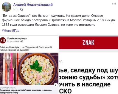 Пользователи в Facebook в конце декабря начали обсуждать насколько "советским" является салат Оливье. Причиной стал пост кулинарного эксперта Евгения Клопотенко о том, что салат - пережиток советского прошлого, и его лучше убрать со своего новогоднего стола.