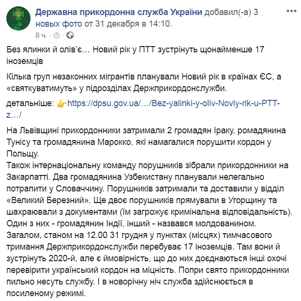 Всего к 12:00 31 декабря в пунктах временного содержания Госпогранслужбы находятся 17 иностранцев. Там они и встретят 2020 год.