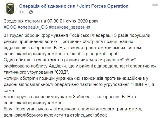 "Вчера, 31 декабря, в результате вражеских обстрелов потерь среди военнослужащих Объединенных сил не было. С начала суток российские оккупационные войска огневой активности не проявляли. Потерь с нашей стороны нет", - говорится в сообщении.