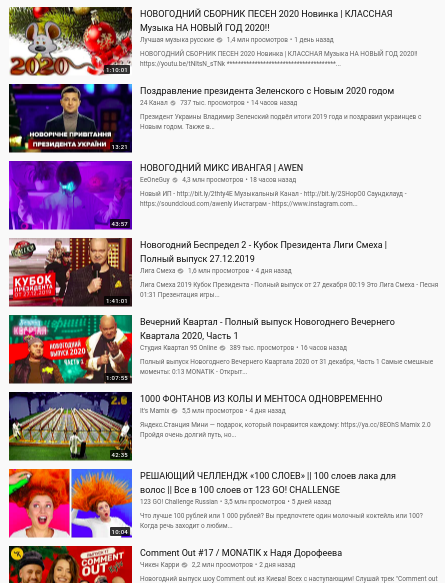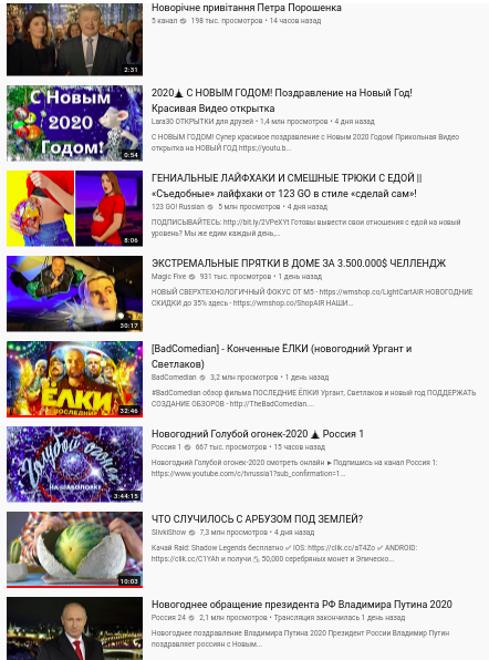 На 12-й строчке поздравление бывшего президента Украины Петра Порошенко. На 18-1 строчке новогодний "Голубой огонек" от "России 1". На 20-м месте новогоднее обращение президента РФ Владимира Путина. Однако большинство видео в трендах не на новогоднюю тематику.