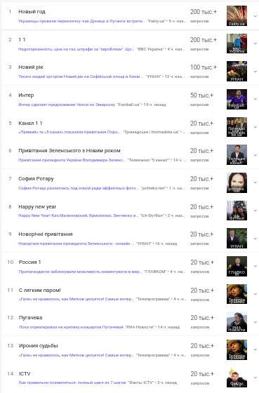Начинает вторую пятерку самых популярных запрос "Привітання Зеленського з Новим роком" - его искали больше 20 тысяч украинцев. Потом идет "София Ротару", "Happy new year", "Новорічні привітання" и "Россия 1". Вероятно, пользователи искали российскую трансляцию "Новогоднего огонька" или обращение президента РФ Владимира Путина к народу.