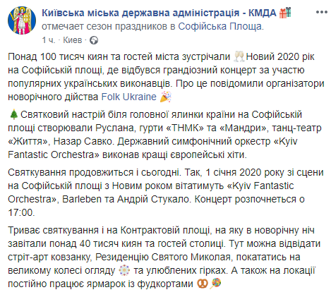 "Более 100 тысяч киевлян и гостей города встречали Новый 2020 год на Софийской площади, где состоялся грандиозный концерт с участием популярных украинских исполнителей. Об этом сообщили организаторы новогоднего действа", - говорится в сообщении.