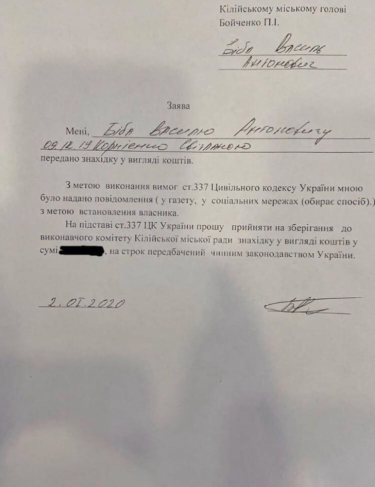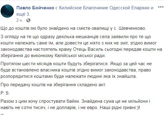 "Учитывая то, что сразу несколько жителей села заявили о том, что средства принадлежат именно им, но доказать это никто из них не смог, согласно требованиям законодательства настоятель храма отец Василий передал средства на хранение. В течение шести месяцев средства будут храниться. Если за это время не будет установлен владелец средств, в соответствии с требованиями законодательства, право распорядиться деньгами предоставят человеку, который их нашел", - написал Павел Бойченко и уточнил, что речь идет о сумме не миллион долларов или евро, а несколько тысяч гривен.