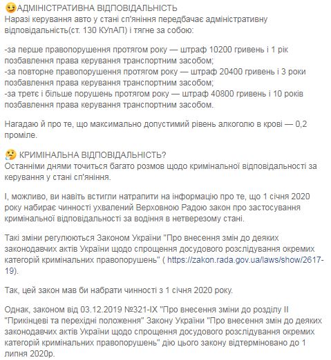 Кроме того, отмечается, что с 1 января 2020 года должен был вступить в силу принятый Верховной Радой закон о применении уголовной ответственности за вождение в нетрезвом состоянии.