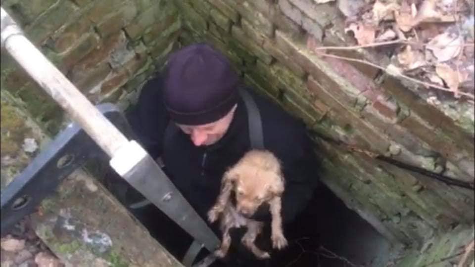 Заглянув в колодец, прохожий увидел грязного щенка, который барахтался в воде, запутавшись ветвях на глубине канализационного колодца. Он сразу позвал на помощь спасателей.
