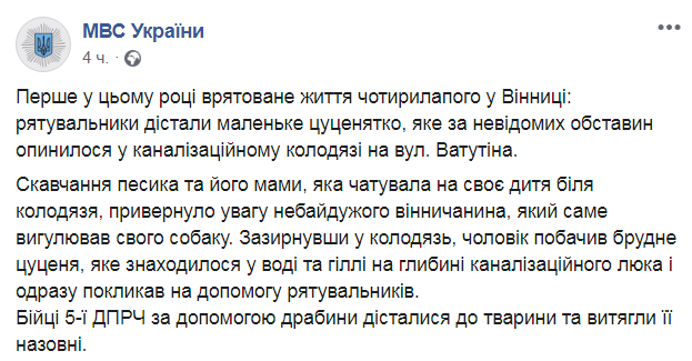 В Виннице спасатели вытащили из канализационного колодца щенка дворняжки, который мог захлебнуться или замерзнуть в воде. О добром поступке сообщается в Facebook Министерства внутренних дел.