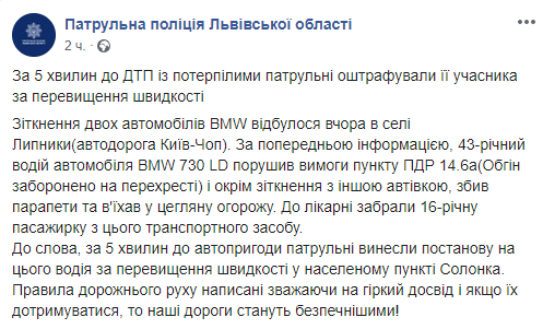 На Львовщине водитель BMW устроил аварию с пострадавшими через пять минут после того, как получил штраф за превышение скорости. Инцидент произошел на трассе Киев-Чоп. Об этом сообщает Патрульная полиция Львовской области на своей странице в Facebook.