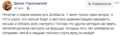 "Почитал о новом канале для Донбасса. У меня только один вопрос: в ОП в курсе, что нельзя будет в местную администрацию направить письмо и обязать всех смотреть? Потому что других методов заставить жителей региона смотреть на ведущих, которые пять лет клеймили их сепарами, ватой и людьми третьего сорта вряд ли выйдет" - написал блогер Денис Гороховский.