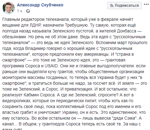 "Главным редактором телеканала, который уже в феврале начнет вещание для ЛДНР, назначили Требушную. Ту самую, которая ещё полгода назад называла Зеленского пустотой, а жителей Донбасса — обезьянами. Но речь не об этом даже. Ведь эта идея с "русскоязычным телеканалом" — это ведь не идея Зеленского.