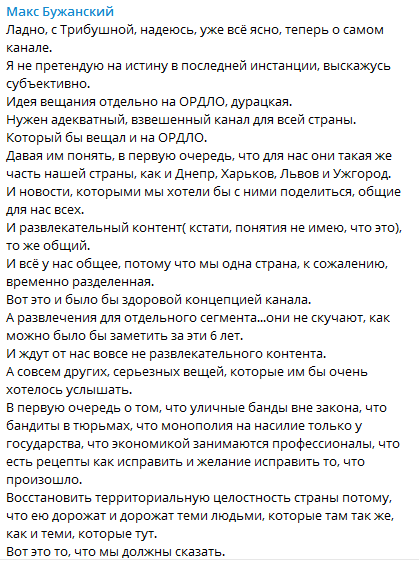 "Ладно, с Трибушной, надеюсь, уже всё ясно, теперь о самом канале. Я не претендую на истину в последней инстанции, выскажусь субъективно. Идея вещания отдельно на ОРДЛО, дурацкая. Нужен адекватный, взвешенный канал для всей страны. Который бы вещал и на ОРДЛО. Давая им понять, в первую очередь, что для нас они такая же часть нашей страны, как и Днепр, Харьков, Львов и Ужгород. И новости, которыми мы хотели бы с ними поделиться, общие для нас всех. И развлекательный контент( кстати, понятия не имею, что это), то же общий. И всё у нас общее, потому что мы одна страна, к сожалению, временно разделенная. Вот это и было бы здоровой концепцией канала.