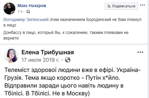 "Владимир Зеленський этим назначением Бородянский не Вам плюнул в лицо. Донбассу в лицо, который Вы, к сожалению, такими плевками не вернете" - поделился одним из постов Трибушной ведущий Макс Назаров.