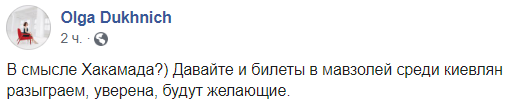 "В смысле Хакамада?) Давайте и билеты в мавзолей среди киевлян разыграем, уверена, будут желающие", – недовольна приездом Ирины журналистка "Нового времени" Ольга Духнич.