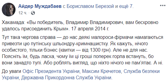 "Тут такое очередное дело – к нам некоторые малороссы-фирмачи пытаются привезти эту путинскую шлюху-крымнашистку. Как говорится, ничего личного, только бизнес (билеты – от 1300 грн). Но не для нас. Объясните им, пожалуйста, почему им эти деньги поперек горла встанут, потому что они слишком тупые. Или делают вид, что никто ничего не помнит. Но нет".