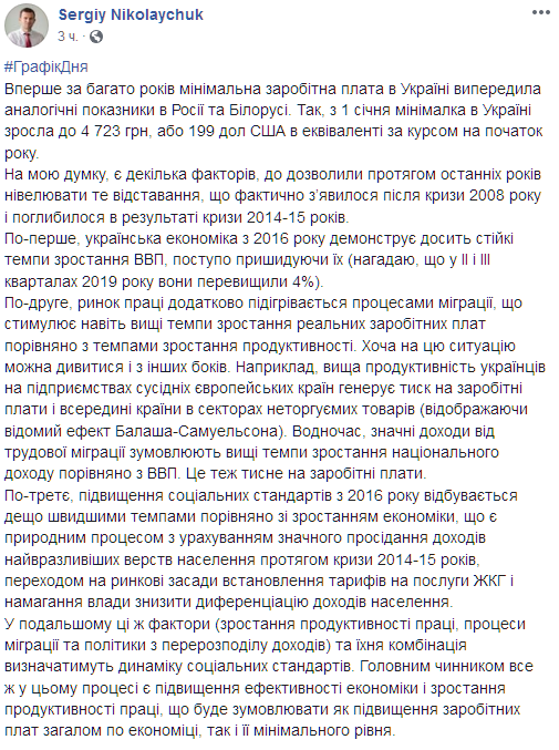 "Впервые за много лет минимальная заработная плата в Украине опередила аналогичные показатели в России и Беларуси. Так, с 1 января минималка в Украине возросла до 4 723 грн, или 199 долларов в эквиваленте по курсу на начало года", - утверждает он.