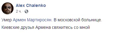 "Умер Армен Мартиросян. В московской больнице. Киевские друзья Армена свяжитесь со мной", - говорится в сообщении.