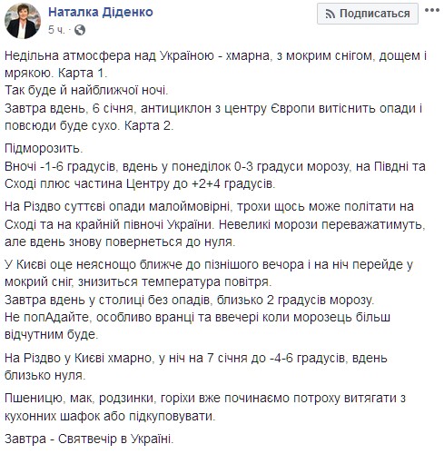 "В Киеве это неясно, что ближе к позднему вечеру и на ночь перейдет в мокрый снег, снизится температура воздуха. Завтра днем в столице без осадков, около 2 градусов мороза. Не попадайте, особенно утром и вечером, когда мороз более ощутимым будет. На Рождество в Киеве облачно, в ночь на 7 января до-4-6 градусов, днем около нуля", - подчеркнула она.