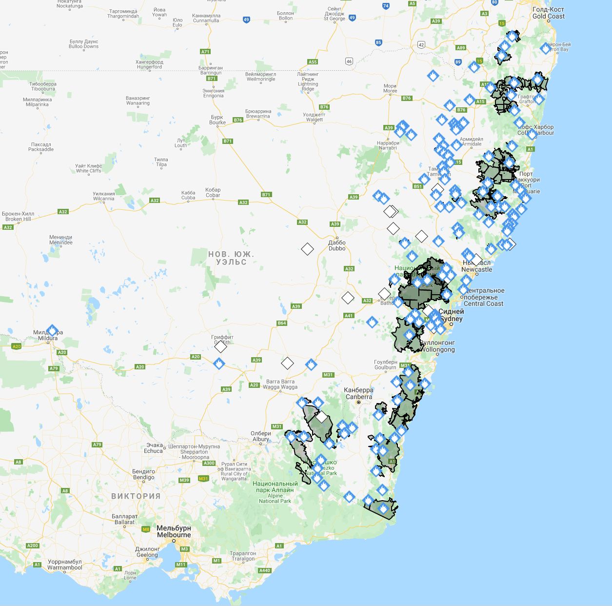 Пожары уничтожили более 5 миллионов гектаров леса. Информация о них в штате Новый Южный Уэльс регулярно обновляется на специальном сайте.