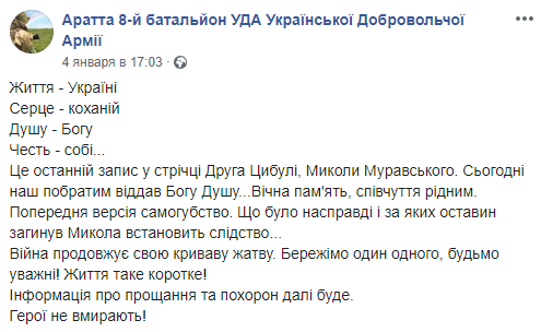 "Наш собрат отдал Богу душу ... Вечная память, соболезнования родным. Предварительная версия самоубийство. Что было на самом деле и при каких обстоятельствах погиб Николай, установит следствие", - говорится в сообщении на странице 8-го батальона УДА "Аратта" в Facebook.