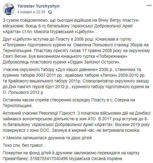 Также он уточнил, что Николай Муравский был активным пластуном с 2006 года. В последнее время способствовал созданию ячейки Пласта в своем родном селе. Также Муравский был активным участником Евромайдана. С началом военных действий на Донбассе занимался волонтерской деятельностью в зоне АТО, а в 2017 году поступил в 8-й батальон Украинской добровольческой армии "Аратта". Осенью 2019 вернулся из зоны ООС. У Николая осталась жена и двое детей.