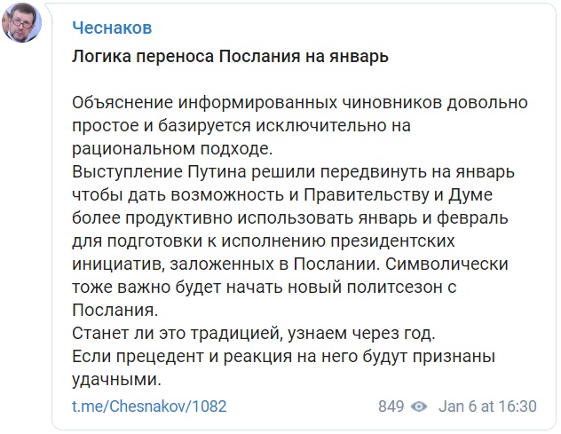 "Объяснение информированных чиновников довольно простое и базируется исключительно на рациональном подходе. Выступление Путина решили передвинуть на январь чтобы дать возможность и Правительству и Думе более продуктивно использовать январь и февраль для подготовки к исполнению президентских инициатив, заложенных в Послании. Символически тоже важно будет начать новый политсезон с Послания. Станет ли это традицией, узнаем через год. Если прецедент и реакция на него будут признаны удачными", - пишет политтехнолог.