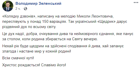 "Колядку колоколов", написанную на мелодию Николая Леонтовича, перепевают в более 150 вариациях. Так украинский "Щедрик" дарит рождественский дух по всему миру", - написал Зеленский. "Это дух надежды, добра, ожидание чуда и невероятного единения, которое царит за столом, когда семья собирается на Святую вечерю. Пусть год будет щедрым на осуществленные надежды и чудеса, пусть воцарится согласие и наступит мир в каждой семье! Всем вкусной кутьи! Христос рождается! Славим его!", - написал Зеленский в своем поздравлении.