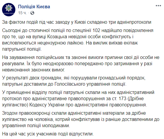 "На требование полицейских прекратить свои действия лица не реагировали. Их неоднократно предупреждали о задержании... В результате двух граждан, которые нарушали общественный порядок, патрульные доставили в Голосеевское управление полиции", - говорится в сообщении ведомства.