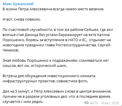 "В жизни Петра Алексеевича всегда имело место везение. И вот, снова повезло. По счастливой случайности, в том же районе Сейшел, где аки волчья стая Деница без устали барражирует на яхте Катина Порошенко, борясь за вступление в НАТО и ЕС, отдыхает на новогодние праздники глава Ростехсотрудничества, Сергей Чемезов", - пишет Бужанский.