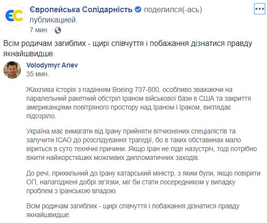 9:39 "Европейская солидарность" Петра Порошенко намекает, что самолет мог сбить Иран и предлагает, "скорее узнать правду".