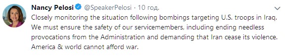 Также Пелоси утверждает, что Соединенные Штаты следят за бомбардировками, а также обязуются обеспечить безопасность своих военнослужащих.