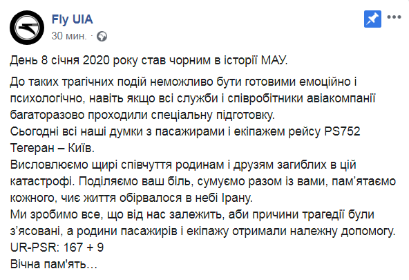 "День 8 января 2020 года стал черным в истории МАУ. К таким трагическим событиям невозможно быть готовыми эмоционально и психологически, даже если все службы и сотрудники авиакомпании неоднократно проходили специальную подготовку. Сегодня все наши мысли с пассажирами и экипажем рейса PS752 Тегеран - Киев", - сказано в записи пресс-службы МАУ.