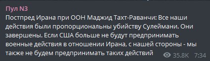 "Все наши действия были пропорциональны убийству Сулеймани. Они завершены. Если США больше не будут предпринимать военные действия в отношении Ирана, с нашей стороны - мы также не будем предпринимать таких действий", - заявил Тахт-Раванчи.
